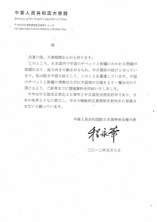 中国の程永華(てい・えいか)駐日大使が、亡命ウイグル人組織による「世界ウイグル会議」の日本開催に抗議し、